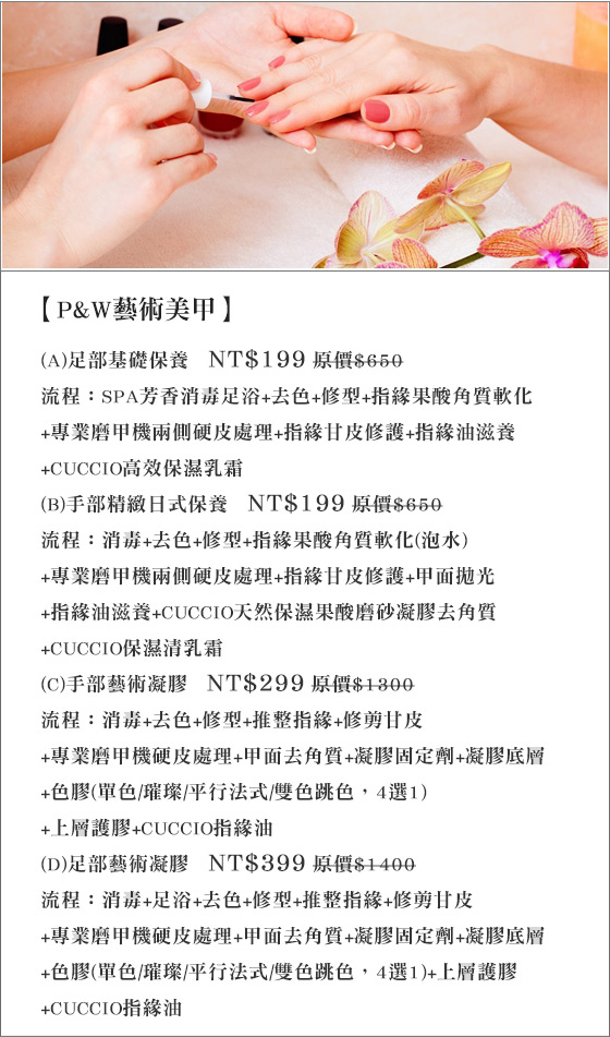 商品訊息簡述: 只要199元起即可享有【P&W藝術美甲】原價最高1,400元基礎保養/藝術凝膠方案:(A)足部基礎保養/(B)手部精緻日式保養/(C)手部藝術凝膠/(D)足部藝術凝膠?